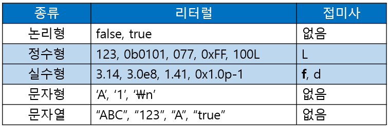 변수와 상수가 값을 저장 할 수 있는 공간이라면 리터럴은 그 공간에 들어가는 값을 의미한다.
