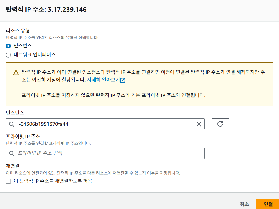 생성한 EC2 인스턴스에 연결해준다. 이제 EC2를 다시 시작하더라도 IP를 그대로 사용할 수 있다.