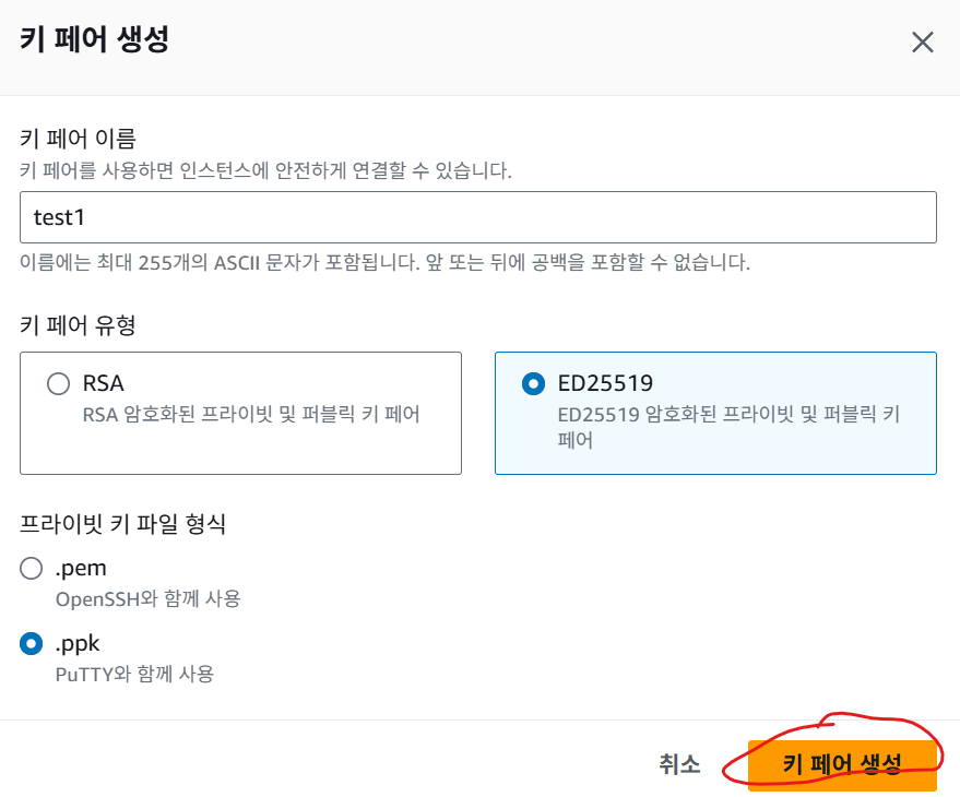 키페어를 생성한다. 필자는 putty로 EC2에 접속할 생각이기 때문에 .ppk로 생성한다.