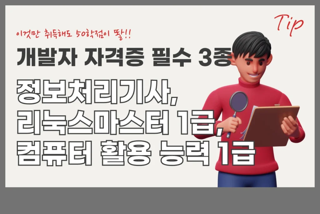 개발자로 취직하기 전에 꼭 취득해야 할 개발자 자격증 필수 3종 세트, 정보처리기사, 리눅스마스터 1급, 컴활 1급을 소개합니다. 이 자격증이 왜 필요한 지와 학점은행제와 연계하면 어떤 이점이 있는지도 함께 설명합니다.