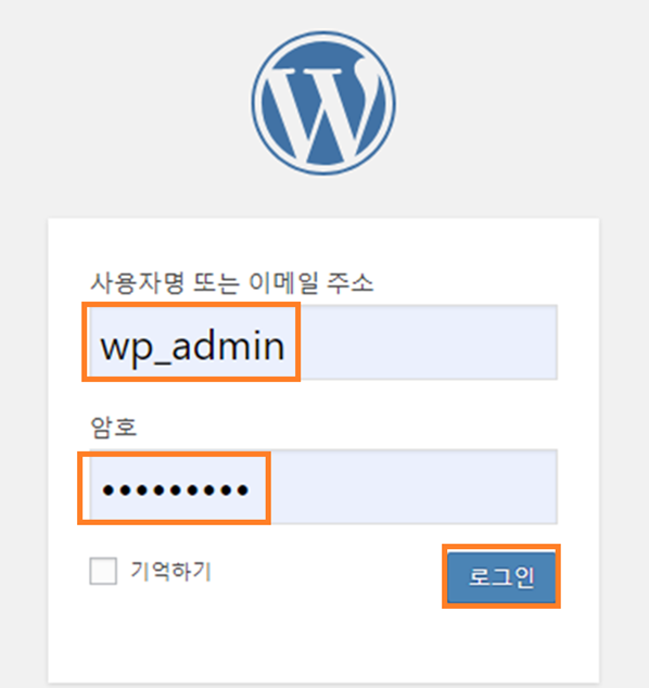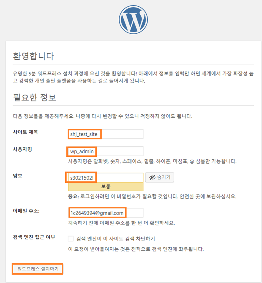 초기 화면이 나타나면 사이트 제목, 사용자명, 암호, 이메일 주소를 입력하고 [워드프레스 설치하기]를 클릭해 설치하면 된다.